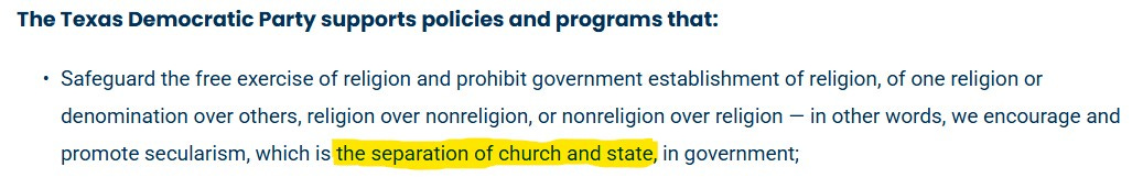 We must hold our side just as accountable as the other side. Religion has no place in our public schools. And this isn’t just my opinion. It’s written in the Texas Democratic Party platform: