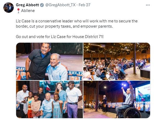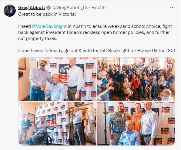 Then, on Tuesday evening, he went to Abilene to fundraise and campaign for a candidate who supports his school voucher program.