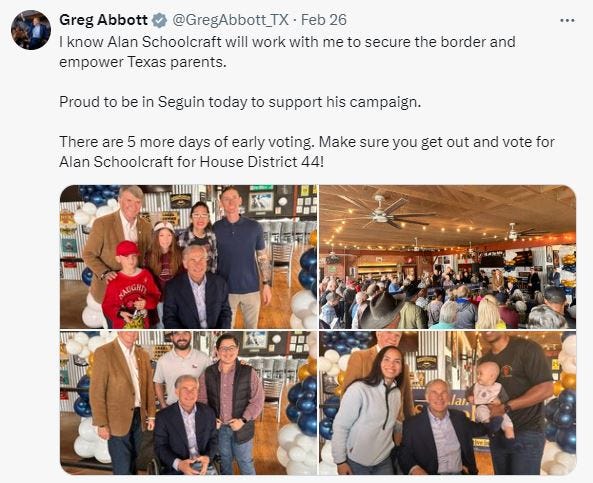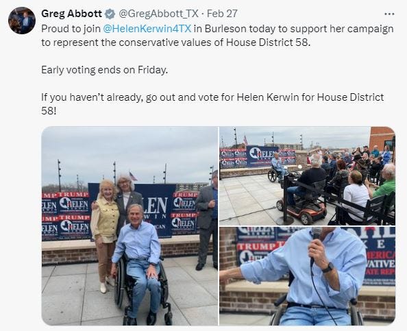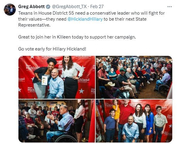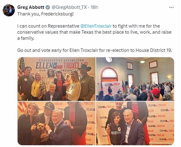 By Wednesday afternoon, Abbott was back in Fredricksburg, fundraising and campaigning for Representative Ellen Troxclair.