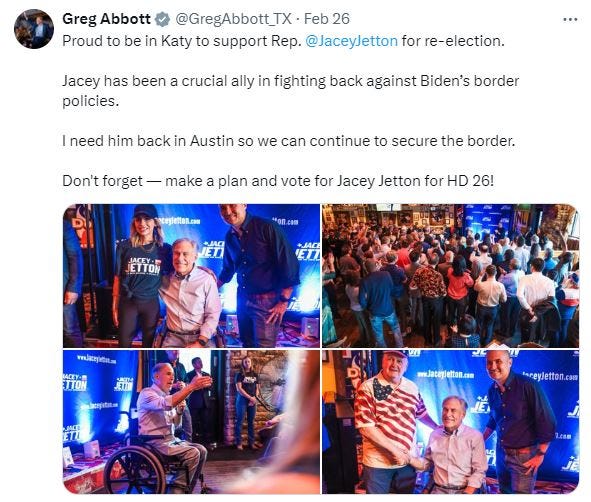 Then, he spent Monday evening in Victoria, fundraising and campaigning for Representative Jacey Jetton.