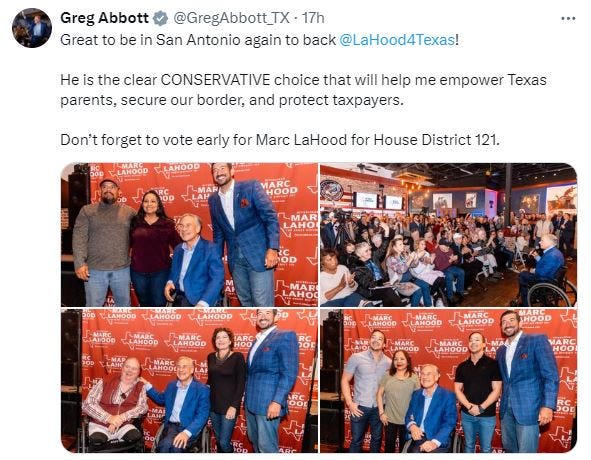Then, last night, Wednesday evening, Abbott went to San Antonio to fundraiser and campaign for that LaHood fellow that all the Republicans keep calling a “liberal.”