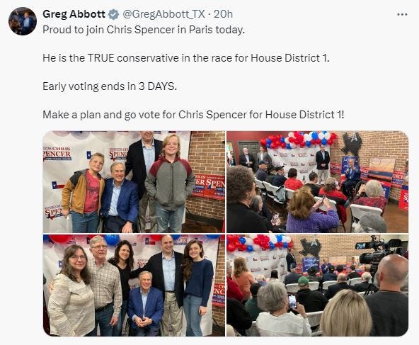 On Wednesday morning, Abbott went deep into Klan territory up in Lamar County to fundraise and campaign.