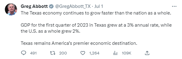 Note: Abbott also bragged about Texas’ GDP. In 2022, the GDP of Texas was $1.88 trillion. Yes, trillion.