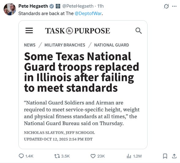 Please remember that Lone Star Left is a BODY POSITIVITY page. I also pointed that out last week when I commented on how many people on the internet were commenting on ABCNews’s Instagram photo of the Texas National Guard, being on the fluffier side of the body-size spectrum. It was mostly ironic that it came one week after Pete Hegseth said, “No fatties in the military.”