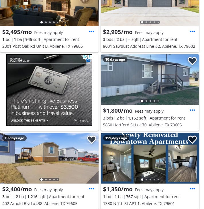 But they need corporate tax abatements, so the people of Abilene can pay $3,000 a month to live in an apartment in Abilene, Texas.