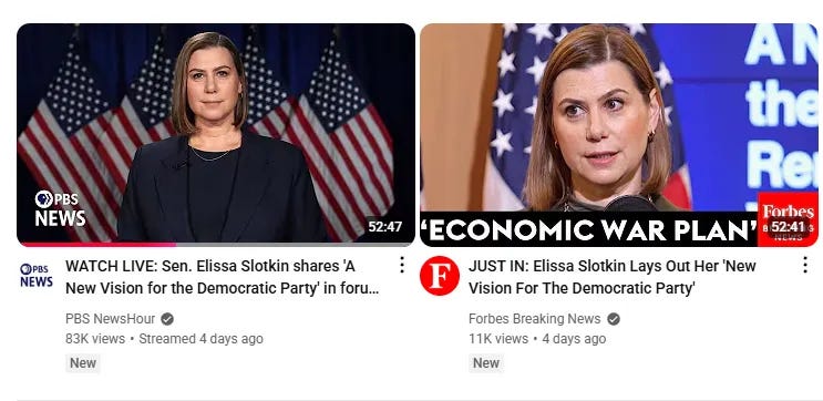 “Her new vision for the Democratic Party.” Not her pitch or proposal, but her vision. The way the media presented it made it feel like this is what the Democratic Party will be doing now, which would be stupid. I wanted to see if, during the same time frame, any other Democrats were presenting different, even opposing, economic messaging on national media.