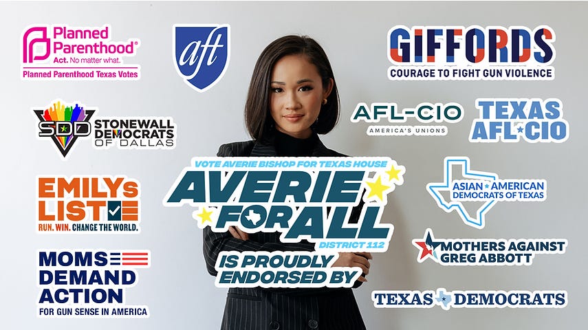 There are a ton of Democratic races I’m excited about here in Texas, and there’s no doubt that Averie Bishop’s race for House District 112 is at the top of the list. Bishop, also the former Miss Texas, has all the qualities that make a great candidate. Her messaging is clear, she is well-liked, super-smart, and working hard to win this seat. Let’s get into it.