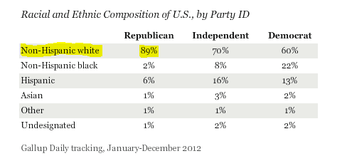 But, since 89% of Republicans are non-Hispanic white, he meant white. But he wouldn’t say white because he knew it would have sounded racist.