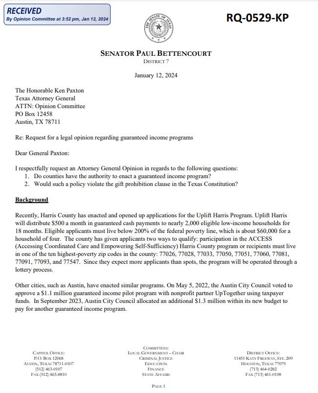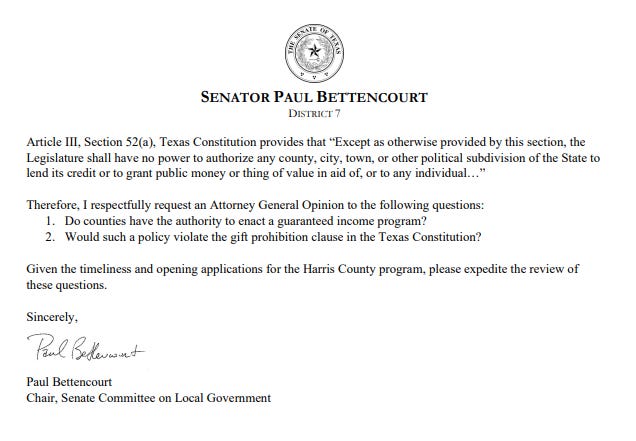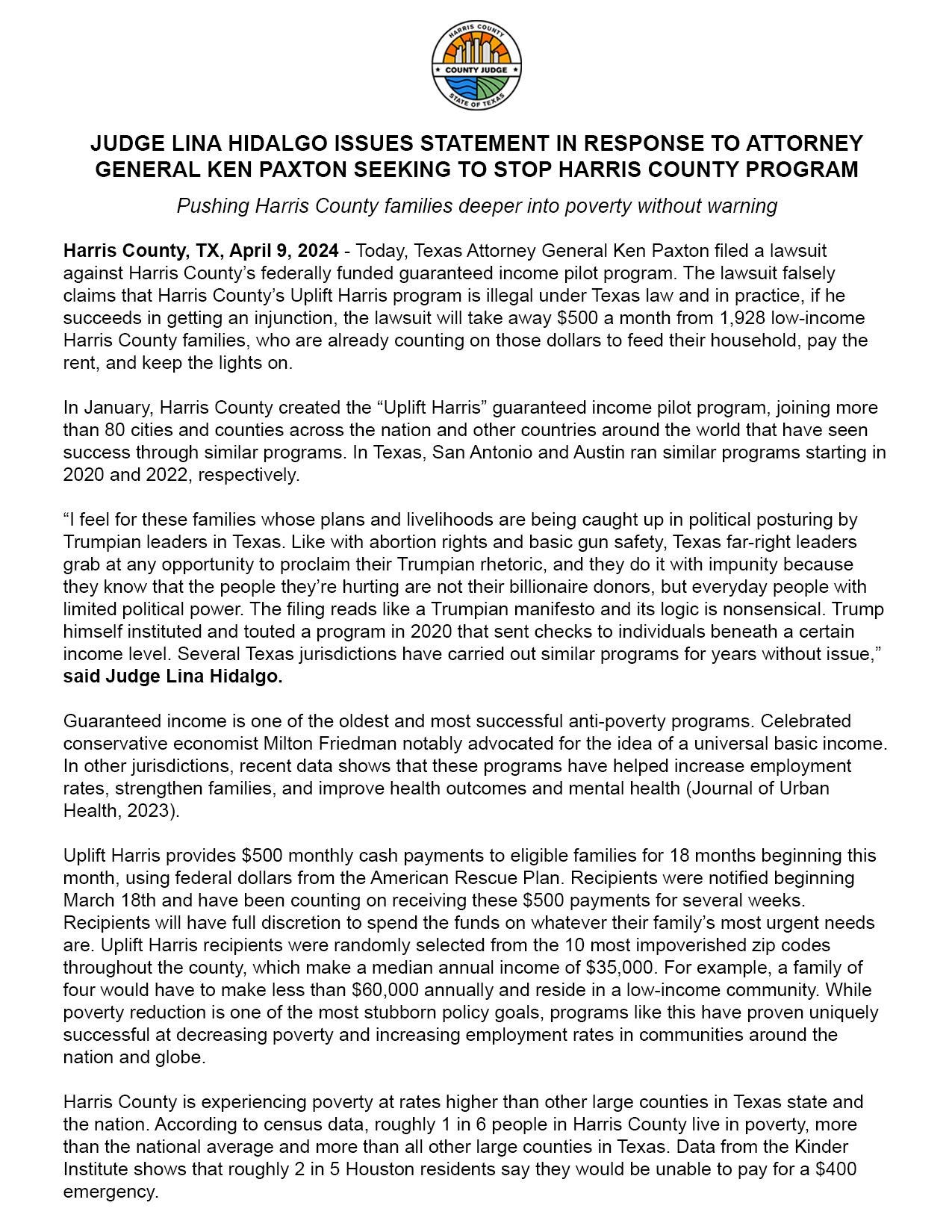Harris County's effort to implement Universal Basic Income through Uplift Harris is a bold step forward in combating poverty and enhancing the quality of life for all its residents, regardless of economic status. In a state where nearly 20% of our children are living in food-insecure households, Lina Hidalgo is doing for Harris County residents what our Legislature has failed at for so long.