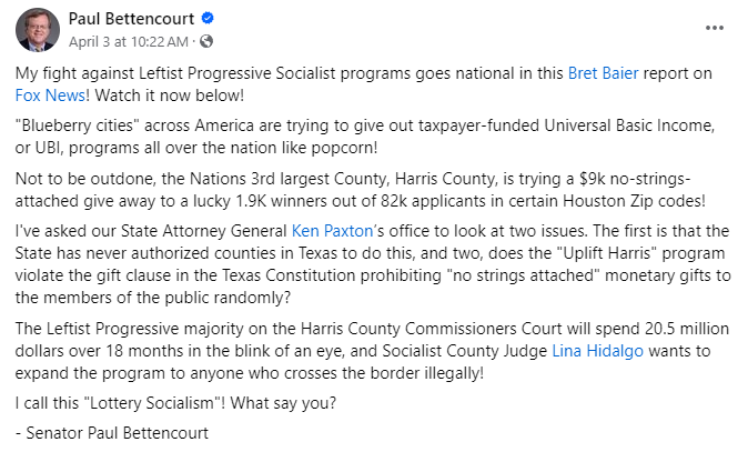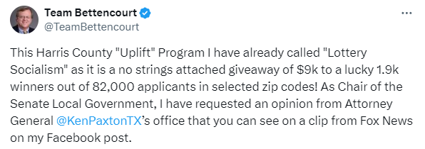 Uplift Harris is no more a socialist program than Social Security or Medicaid. Bettencourt and Paxton’s attack on it directly targets Harris County because it is the largest Democratic stronghold in Texas.