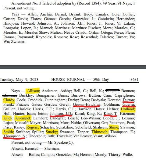The Representatives underlined in red are Democrats who voted “no” with Republicans and did not ask the clerk to correct their vote in the journal. These included Harold Dutton (D-HD142), Barbara Gervin-Hawkins (D-HD120), Bobby Guerrera (D-HD41), Jarvis Johnson (D-HD139), Tracy King (D-HD80), and Senfronia Thompson (D-HD141). Note that neither Johnson nor King will return to office in the 89th.