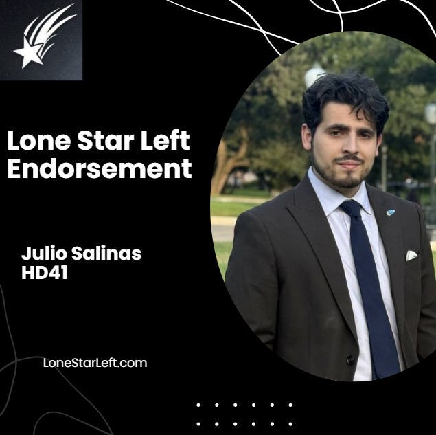 That’s why Lone Star Left endorsed Julios Salinas for HD41 in the Democratic primary, and why I continue to support him throughout this runoff.