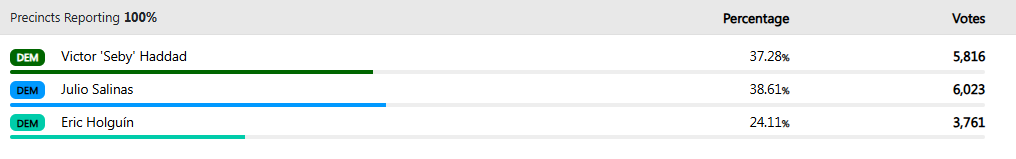 Runoff turnout will be less than the primary. That’s just the nature of the game. Not only will the key to winning for Salinas and Haddad be getting their voters to come out again, which they were already very close to doing, but they also have to try to win over Holguin’s voters.