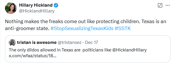 Hillary Hickland (R-HD55) is like Carrie Isaac, poised to crown herself the empress of “I’ll legislate it because it sounds scary” regarding her attempts to reignite a Texas war against dildos. But in another sense, Hickland is also channeling Nate Schatzline’s particular brand of obsessive fear-mongering. Schatzline built his reputation by seeing threats to children’s morality lurking around every corner, often where none exist. From drag shows to libraries, he’s turned policy-making into a crusade against imaginary sexual boogeymen.