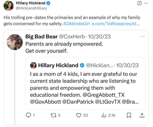 Hickland made a relatively benign comment: “Parents are already empowered. Get over yourself.”—and somehow twisted it into a personal safety concern, implying she would shoot the person who said that (#2AKindaGirl).