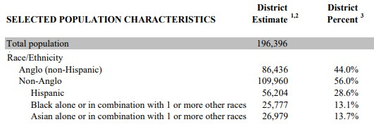 HD132 encompasses Katy, the outskirts of Harris County around Katy, Cinco Ranch, and a tiny sliver of Houston. This district is 56% non-Anglo.