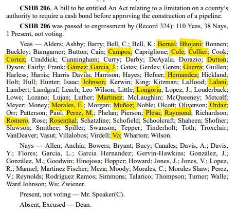 This bill takes away one of the only local tools left to hold pipeline developers accountable. It hands more power to fossil fuel corporations while undermining counties trying to protect their roads, land, and residents. Once again, Texas Republicans are prioritizing corporate profits over environmental safeguards and local control.