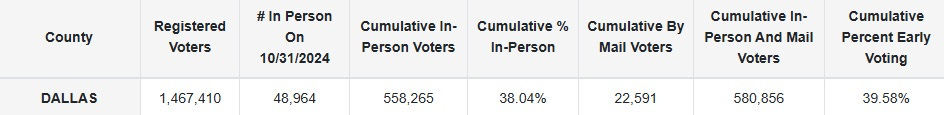 Dallas County is showing 585,904 total on the Dallas County Elections website, while the SoS website shows Dallas County’s total turnout of 580,856.