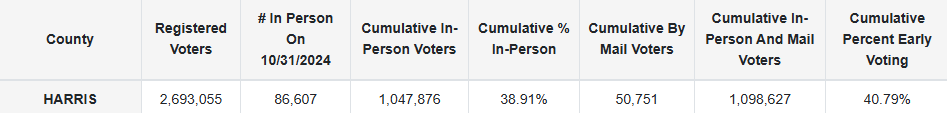 Between the numbers that still have to catch up and the last day of early voting, I’m hoping we break the 9 million threshold of early voters. We’ll know tomorrow, but I would give the SoS until Monday to catch up. Tomorrow will be the last early voting update I’ll provide for this election cycle.