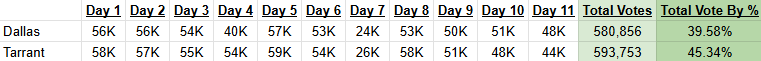 Tarrant County is still beating Dallas County in turnout. This is amazing because I’ve been getting reports of Republican shenanigans in Tarrant County.