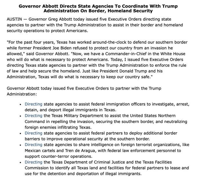 Also, yesterday, our feckless leader issued several new executive orders directing our state military, paid for with our state dollars, to “assist with border operations.”