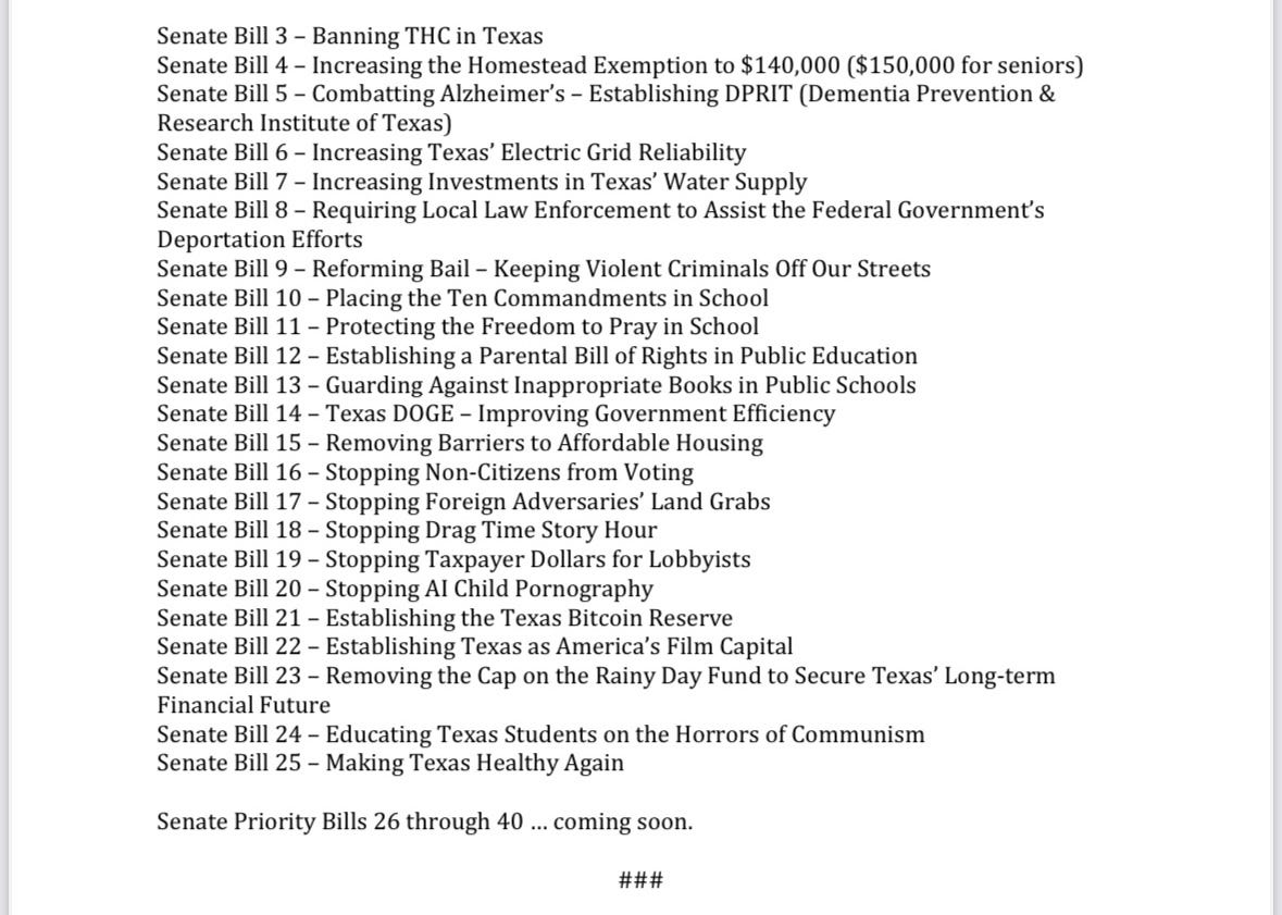 I’m not going to rehash all of his wish lists, but Patrick’s top priorities for the 2025 legislative session read like a parody of a far-right fever dream filled with culture-war nonsense. Instead of addressing real issues facing Texans, like crumbling infrastructure, unaffordable healthcare, and teacher shortages, Patrick is focused on banning THC and protecting the Ten Commandments in schools. Apparently, public education’s biggest concern isn’t teacher pay or overcrowded classrooms but making sure that kids can “pray in school” without interference.