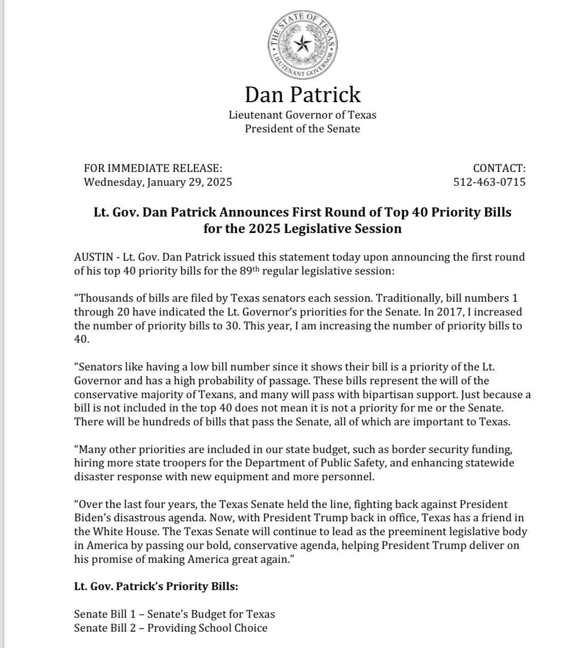 Lieutenant Governor Dan Patrick published his list of the top 25 priorities for this legislative session yesterday. Needless to say, Mr. Marylander is entirely out of touch with Texans’ needs and wants.