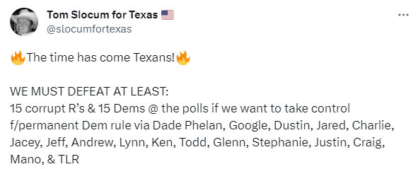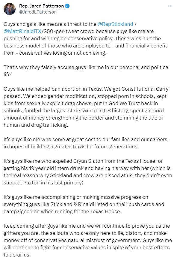 If the Republicans managed to take down the far-right PAC, Texans for Lawsuit Reform, that’ll be a win for all Texans. It’s hilarious because they’re calling Jared Patterson a “RINO.” But Jared Patterson literally hangs out with domestic terrorists (DFW Deplorables), has called the majority of Texans mentally ill for not supporting the GOP, and was responsible for implementing vagrancy laws and the book-burning bill.