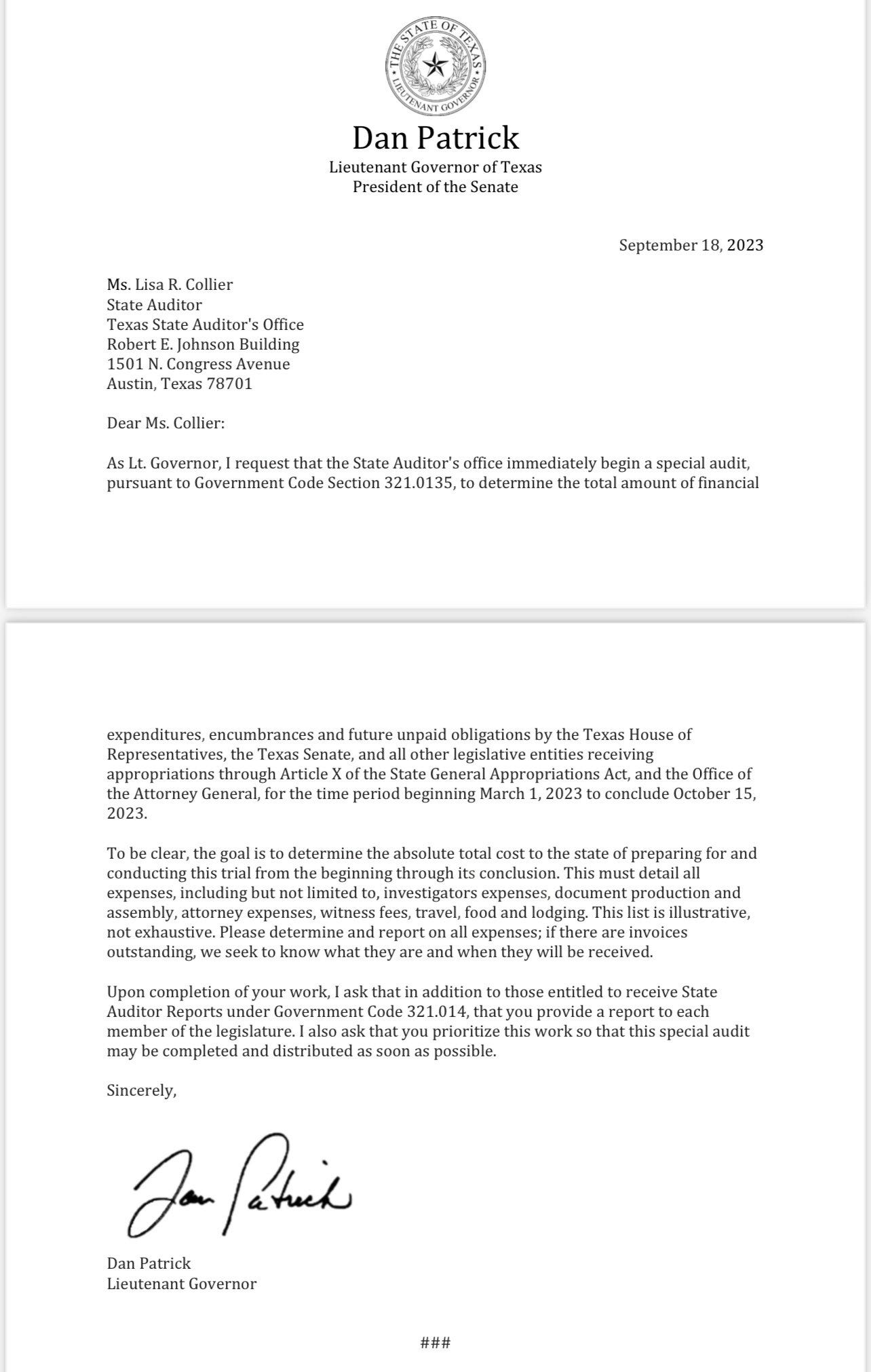 On that same day, Dan Patrick also ordered an audit of the impeachment trial.