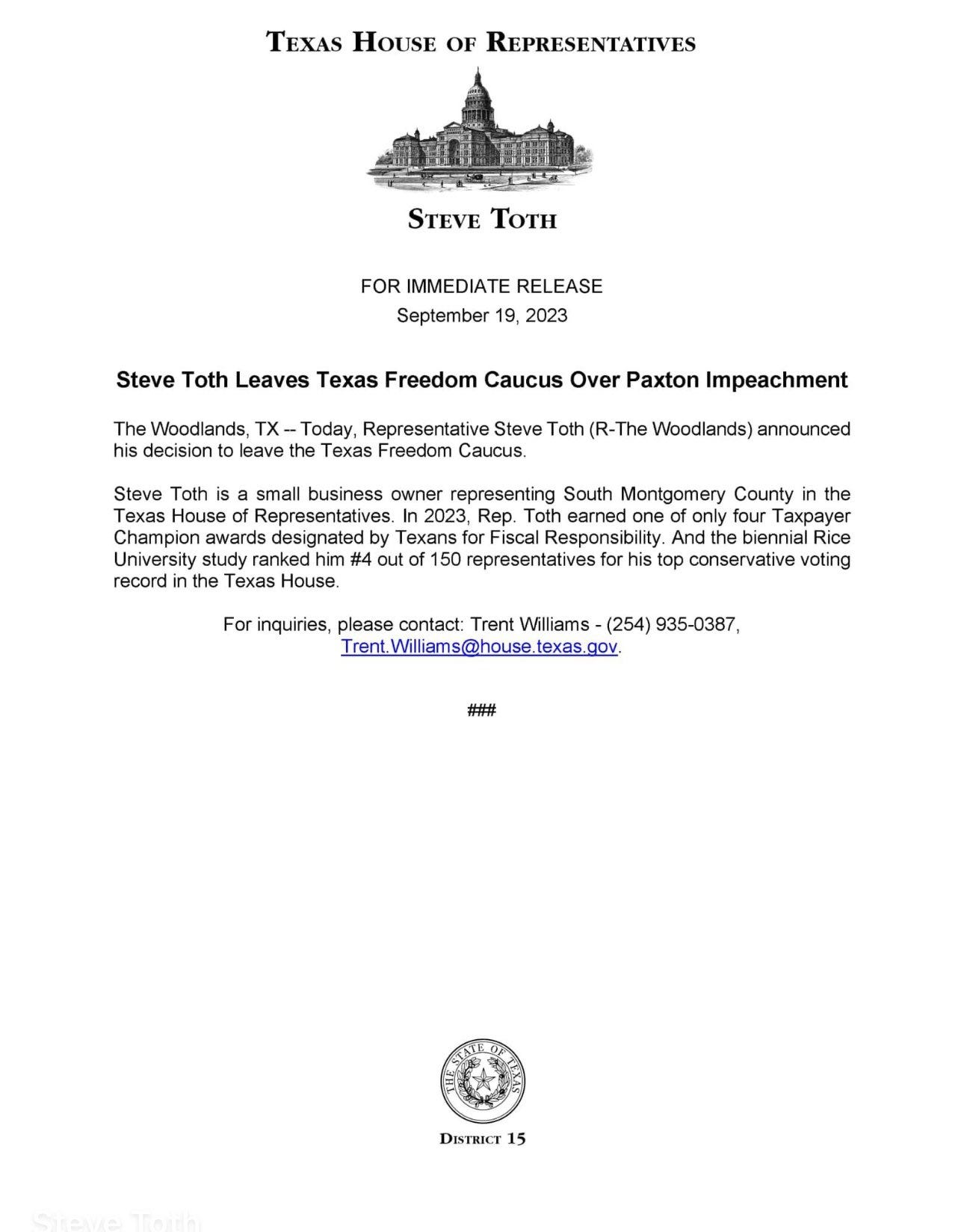 In related news, Montgomery County Representative Steve Toth pulled out of the Texas Fascist Freedom Caucus.