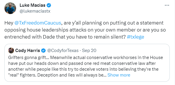 Because of that, Anderson County Representative Cody Harris called Harrison a grifter. The Defend Liberty PAC cheerleader, Luke Macias, then asked if the Texas Freedom Caucus planned on putting out a statement opposing House leadership’s attack on their members.