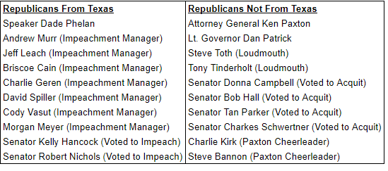 However, I’d like to point out (again) that the anti-impeachment crowd mainly consists of carpetbaggers, while the pro-impeachment group consists of real Texans. Case in point: