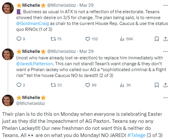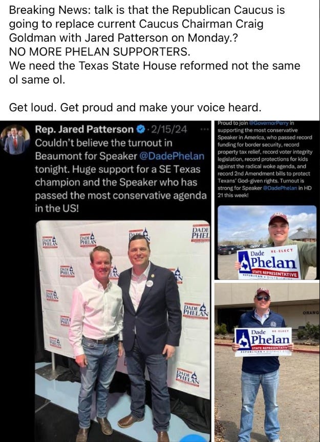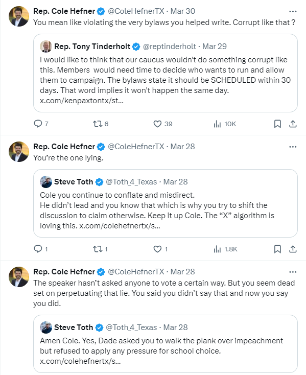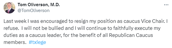Over the weekend, rumors swirled that Craig Goldman plans to step down because he’s running for Congress. And while the natural order of progression would mean the Vice Chair, Tom Oliverson, stepping up to that role, there have also been rumors of him stepping down to run for House Speaker.