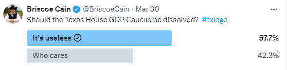 Yesterday, Harris County Republican Representative Briscoe Cain asked, “Should the Texas House GOP Caucus be dissolved?”