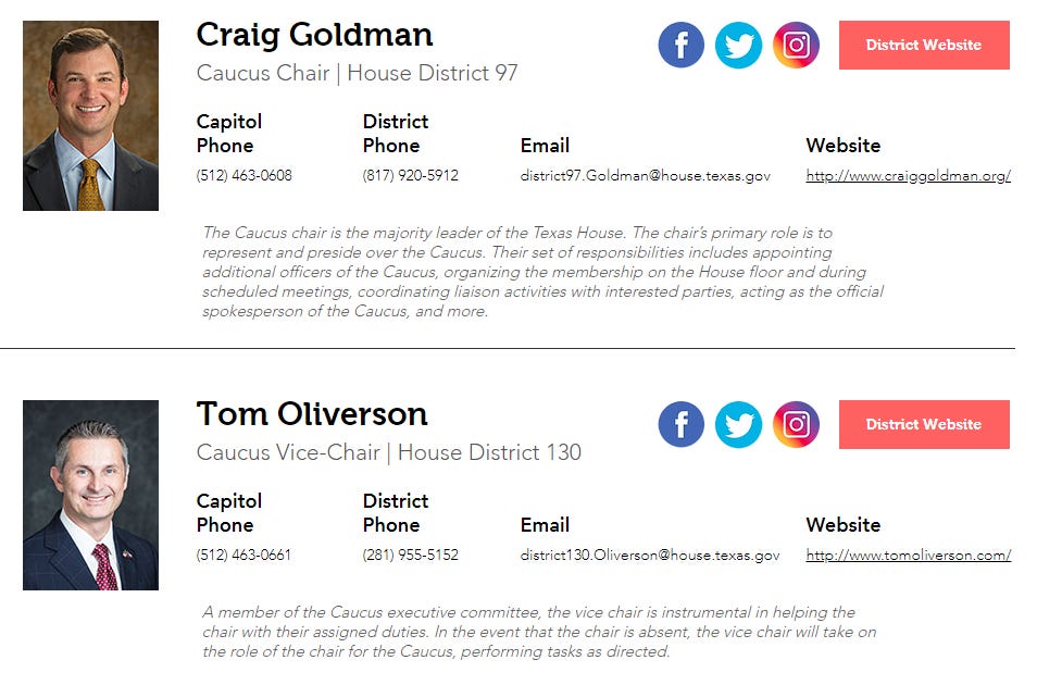 The GOP House Caucus leadership currently has Representative Craig Goldman as chair and Representative Tom Oliverson as Vice Chair.