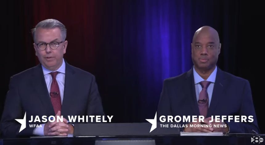 First and foremost, we all know that the moderators in any debate can help or hurt a candidate. Jason Whitely from WFAA and Gromer Jeffers with the Dallas Morning News moderated last night’s debate.