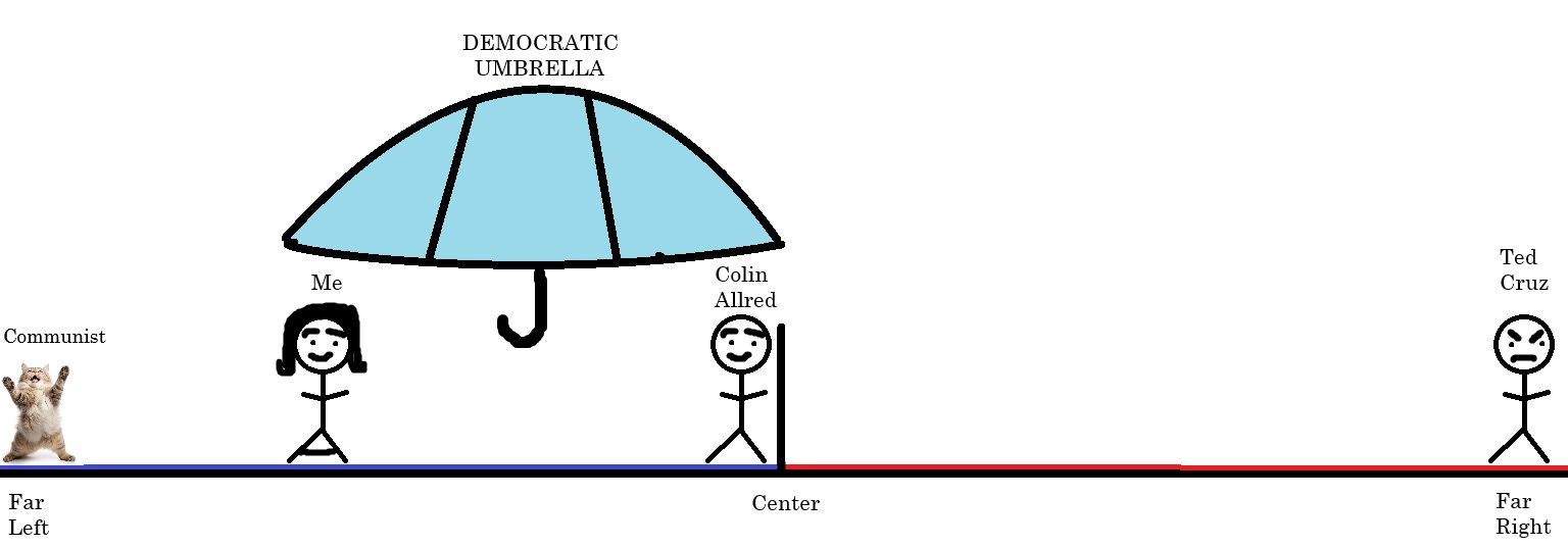 As you can see, Colin Allred and I are under the Democratic Umbrella. It’s a big umbrella—sometimes, people call it a big tent. Ted Cruz is way, way, way over there on the far right ➡️ and communists are way over there on the far left ⬅️. Obviously, communists aren’t under the umbrella. But maybe Ted Cruz is SO far to the right that even the left of the center seems radical.