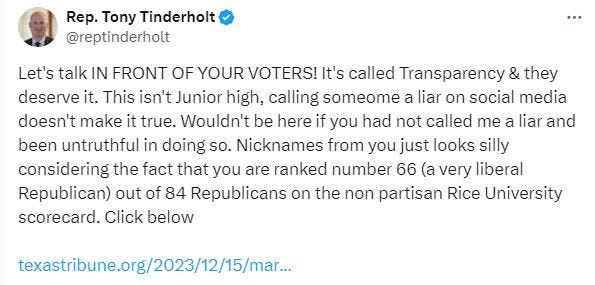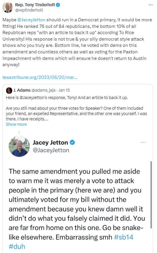 The first fight Tinderholt is having is with Fort Bend County Representative Jacey Jetton (R). From what I can tell, it started with some he-said/she-said stuff over an amendment (or multiple amendments) during the legislative session. And have spun out of control from there.