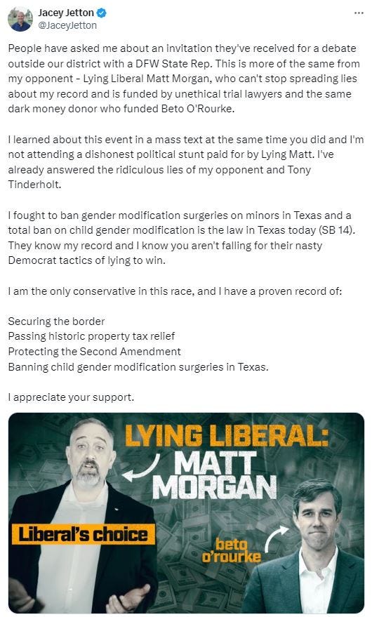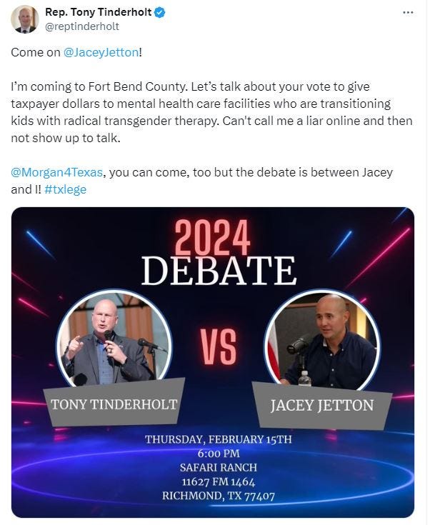 As far as I can tell, Jetton mostly ignored Tinderholt after that. Then, Tinderholt challenged Jacey Jetton to a debate.