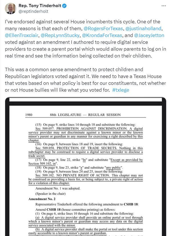 Eventually, in January, this blew up to Tinderholt and Jetton arguing online and Jetton calling Tinderholt a “snake.” Tinderholt responded with a screenshot of an entirely separate bill and amendment he pushed that failed. His premise was, “Look how hard I’ve worked to save children in Texas and look at the Republicans who fought against it.”
