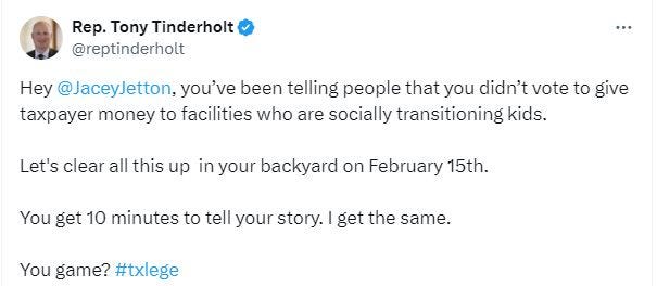 After that, Tinderholt had been telling people that Representative Jetton was pro-trans. For the record, Jetton not only voted for the anti-LGBTQ legislation (SB14), but he was also a co-sponsor.