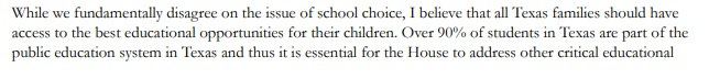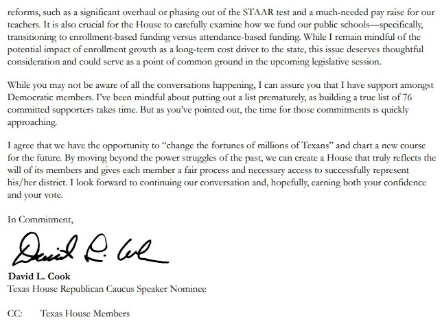 Lastly, Cook dangled the ways Texas schools are funded in the last part of the letters. A rouse to convince Democrats to vote for their own demise?