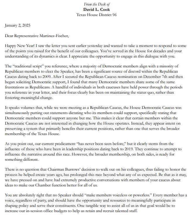 Representative Cook responded to Representative Martinez-Fischer in a letter on Thursday, even though Martinez-Fischer’s memo was to uncommitted Democrats, not Cook.