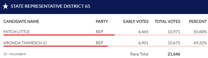 In March, ultra-fanatic Mitch Little unseated “alleged” moderate Kronda Thimesch by less than one point (296 votes).