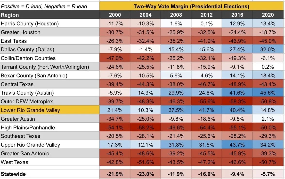 Denton and Collin Counties have moved a staggering 41 points to the left since 2000, shifting an average of 8.16 points to the left each four-year election. (Except for 2012, when Democrats didn’t show up.)