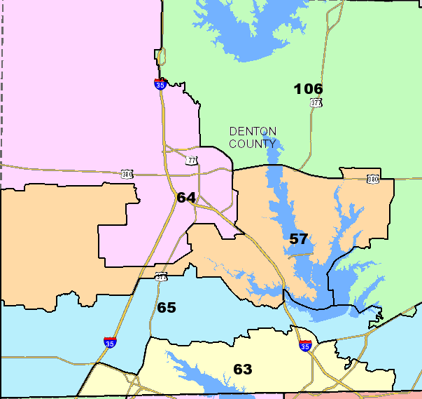 HD65 encompasses the northern parts of Carrollton, Lewisville, and Flower Mound. It also includes small parts of The Colony, Plano, Dallas, and several smaller suburban areas.