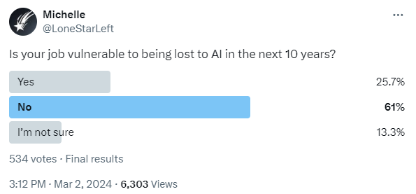A few months ago, I conducted a (very scientific) Twitter poll, asking if people believed that their jobs were at risk from AI. Here is what they responded: