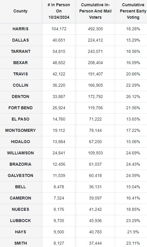 Here are the turnout numbers from Day 4 in the top 20 Texas Counties from the Secretary of State.