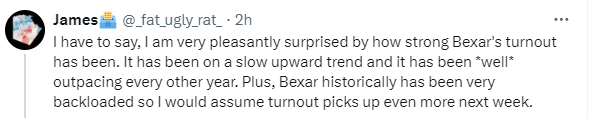 If you’ve read any of my previous election updates this week, you know I’ve been pretty optimistic about voter turnout in Texas. Our in-person turnout has been higher than in 2020, but the mail-in votes are much lower. Many political data people in Texas are looking at where we are, and some are nowhere near as optimistic as me.