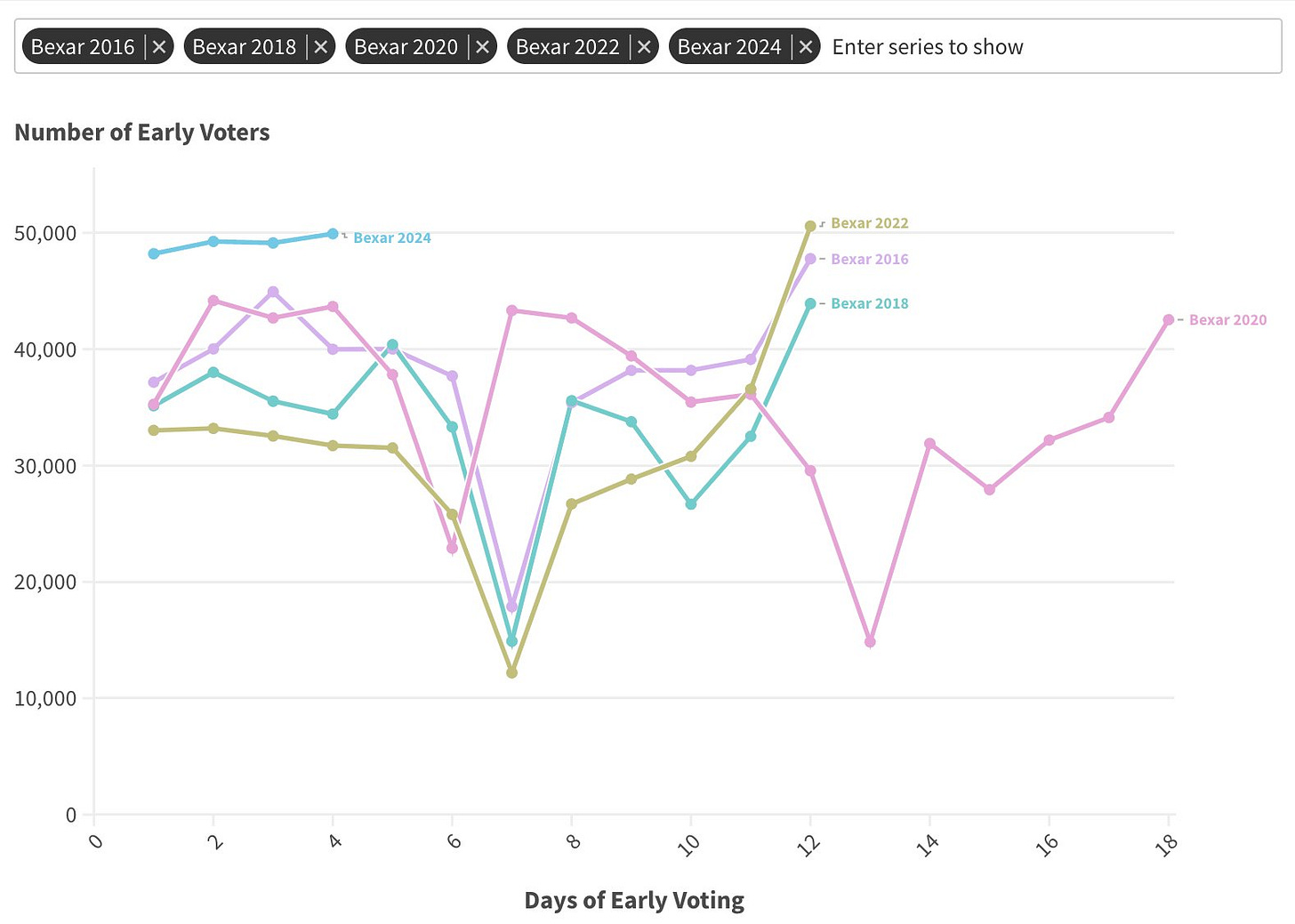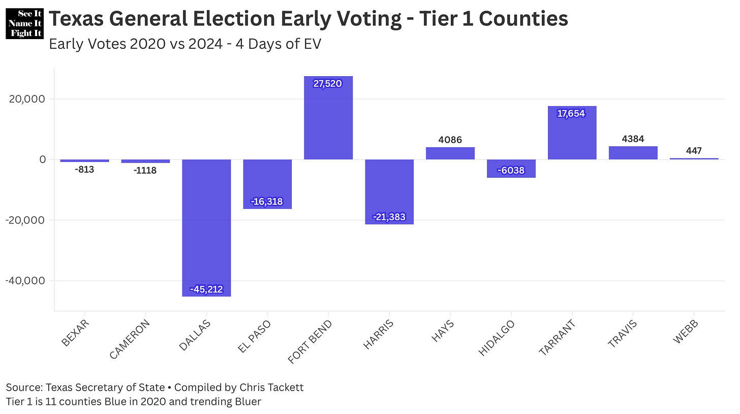 He classifies the “Tier 1” counties as the counties that are blue and getting bluer. Looking at the combined in-person and mail-in voting through Day 4 of early voting in 2024, compared to 2020, shows counties like Dallas and Harris way down, while Bexar is close to breaking even, despite the cheers of record turnout.